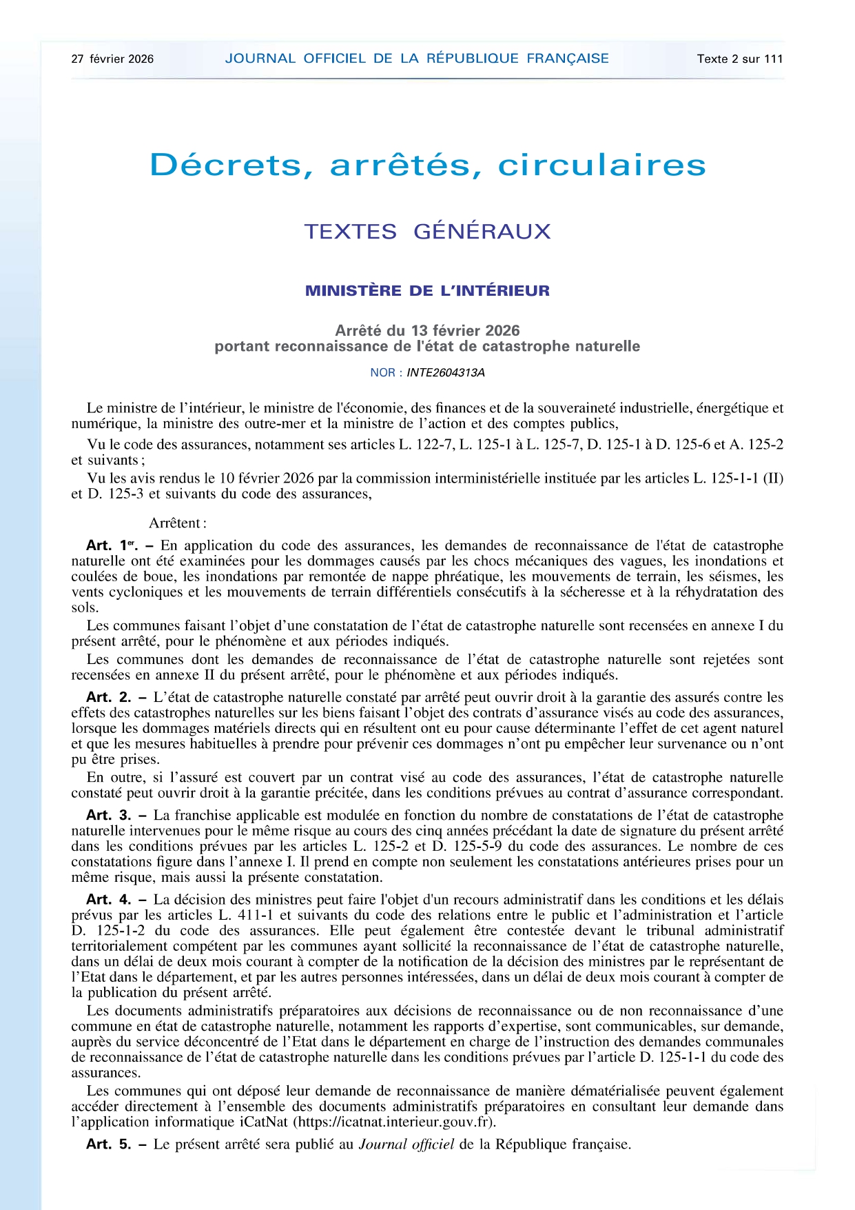 ARRÊTÉ CATASTROPHE NATURELLE