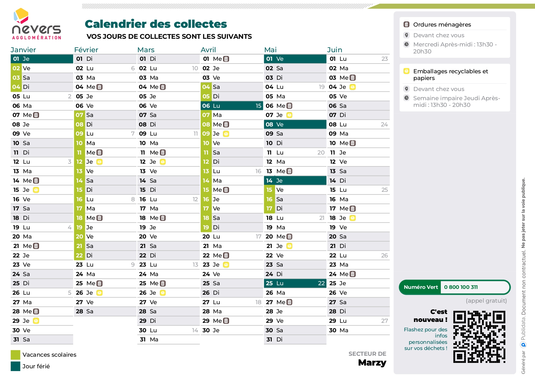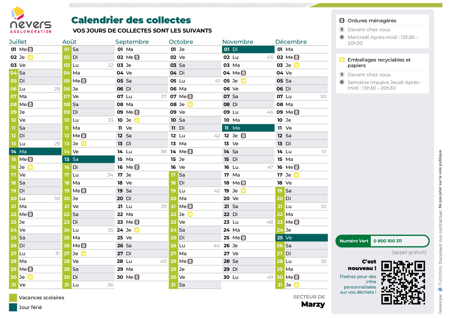 Les déchets verts, tailles diverses, gazons ne seront en aucun cas collectés avec les ordures ménagères. Ils peuvent être acheminés vers les déchetteries, mais l’idéal n’est-il pas, lorsqu’on dispose d’un grand terrain (comme la plupart des habitants de Marzy) de faire du compost pour le jardin avec ses tontes de gazon.